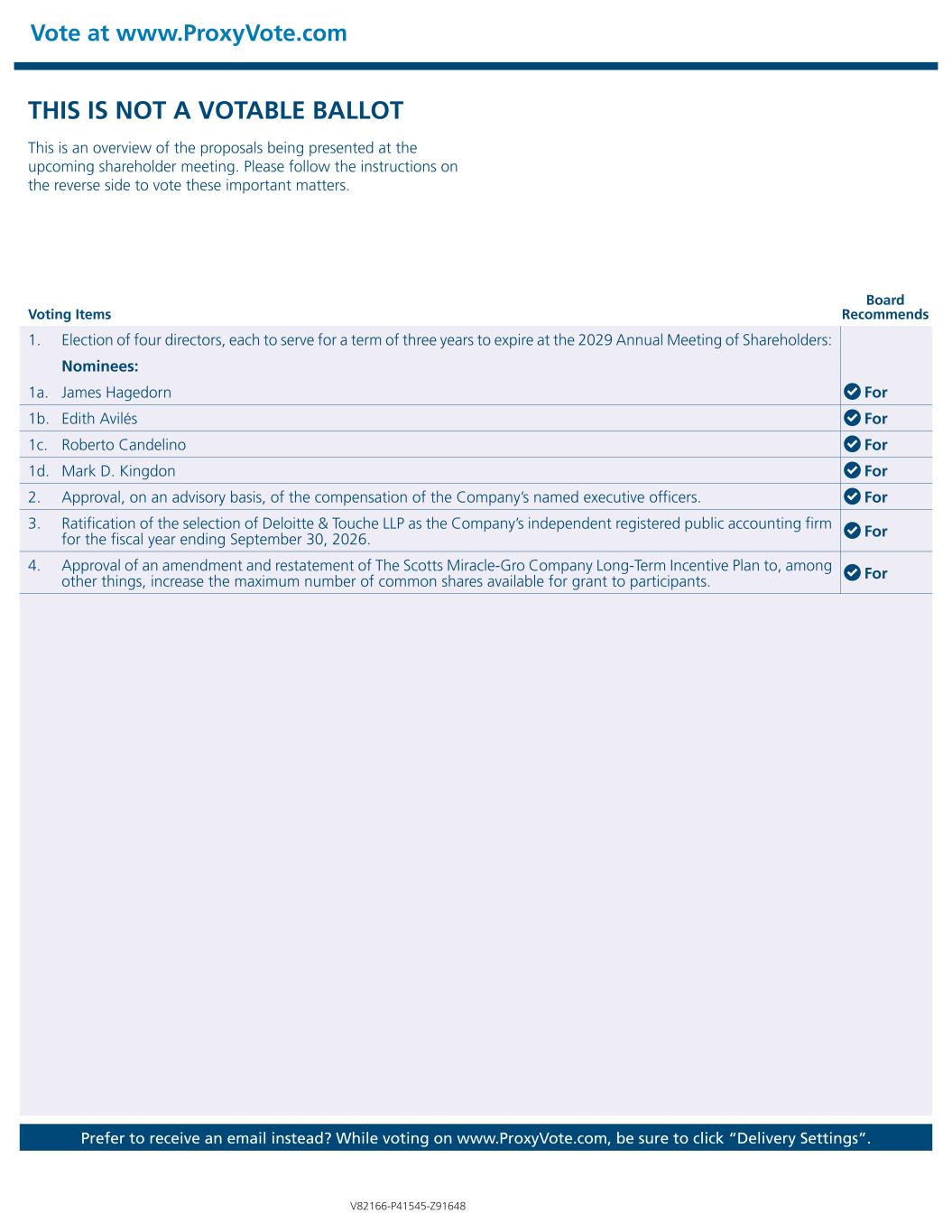 Vote at www.ProxyVote.com Prefer to receive an email instead? While voting on www.ProxyVote.com, be sure to click “Delivery Settings”. Voting Items Board Recommends V82166-P41545-Z91648 THIS IS NOT A VOTABLE BALLOT This is an overview of the proposals being presented at the upcoming shareholder meeting. Please follow the instructions on the reverse side to vote these important matters. 1. Election of four directors, each to serve for a term of three years to expire at the 2029 Annual Meeting of Shareholders: Nominees: 1a. James Hagedorn For 1b. Edith Avilés For 1c. Roberto Candelino For 1d. Mark D. Kingdon For 2. Approval, on an advisory basis, of the compensation of the Company’s named executive officers. For 3. Ratification of the selection of Deloitte & Touche LLP as the Company’s independent registered public accounting firm for the fiscal year ending September 30, 2026. For 4. Approval of an amendment and restatement of The Scotts Miracle-Gro Company Long-Term Incentive Plan to, among other things, increase the maximum number of common shares available for grant to participants. For